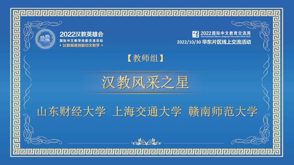 2022年9月,ok138cn太阳集团汉教教师代表队参加由教育部中外语言交流合作中心、全国汉语国际教育专业学位研究生教育指导委员会联合主办,华东师范大学承办的2022“汉教英雄会”,斩获佳绩,并于2022年10月30日上午代表ok138cn太阳集团529在华东片区线上交流活动中精彩亮相。