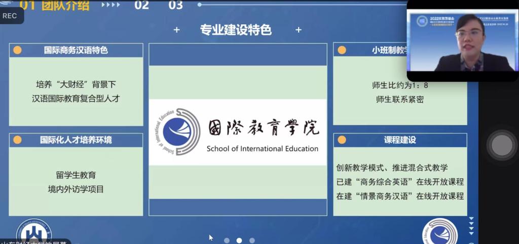 王明月老师作为团队代表进行交流汇报。汇报内容主要从“团队介绍”“课程简介”“教学设计”三个层面展开。课程及教学设计紧密围绕2022汉教英雄会活动主题“以新标准创新中文教学”,以《国际中文教育中文水平等级标准》中提倡的变革创新精神为指导,进一步结合新《标准》对高级“听”的能力的具体要求,从“理念变、方法变、内容变”三个层面,凸显“科技赋能,资源重构”“产出导向,效率提升”“润物无声,思政融入”设计亮点。