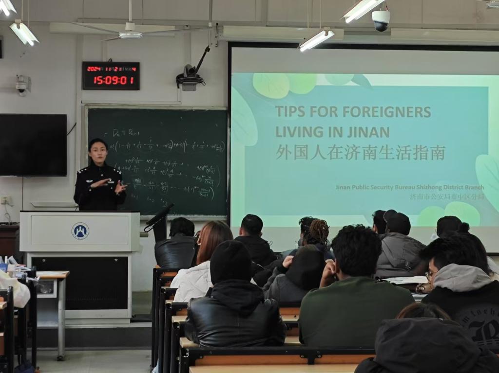 入学教育活动中,济南市公安局市中区分局治安大队出入境管理科张慧警官为来华留学生新生做了中国法律法规宣讲。张慧用英文详细解读了《中华人民共和国外国人出入境管理条例》,她强调留学生在中国境内求学期间须遵守中国法律法规,不得危害中国国家安全、破坏社会公共秩序,严禁触犯法律,帮助来华留学生树立法治思维,提升法律意识。