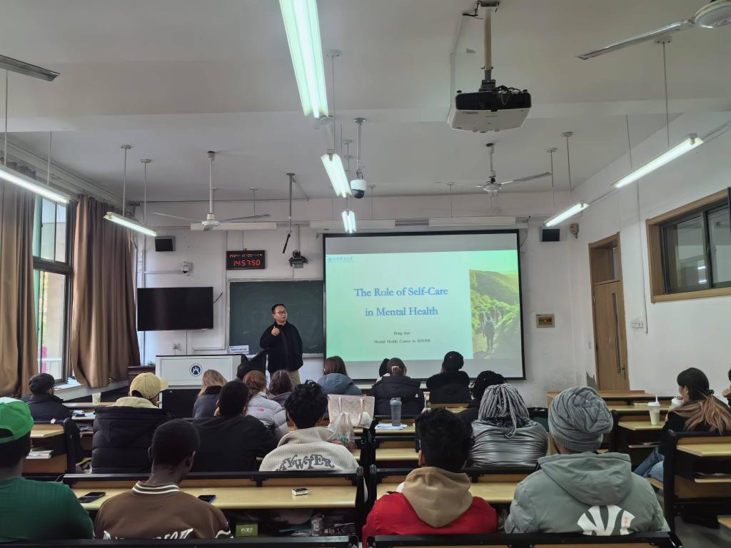 针对留学生可能面临的种种心理压力与挑战,学院积极采取行动,开展了以“The Role of Self-Care in Mental Health”为主题的心理辅导讲座。该活动由心理咨询中心孙鹏老师主讲,孙老师从人际交往、生活态度等方面为留学生提供全方位的心理支持与引导。此举旨在帮助留学生更好地适应在华学习生活,增强心理韧性,同时也促进了不同文化背景学生间的相互理解和友谊。学院也将持续关注留学生的心理健康状况。