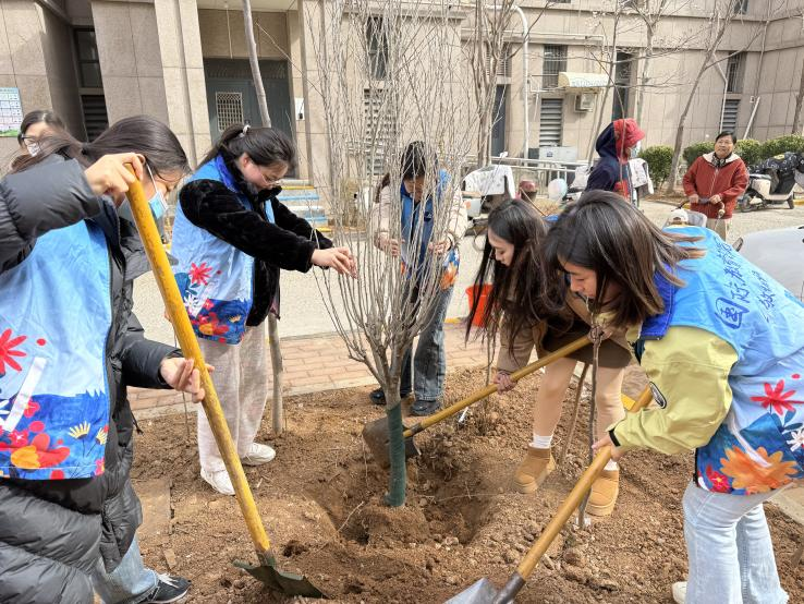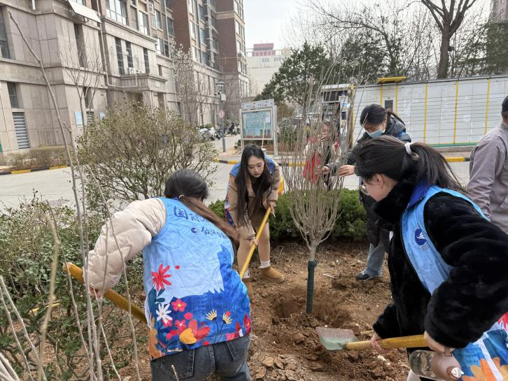 经过三小时的辛勤耕耘,海棠、紫叶李等20余株树苗在三号楼北侧花园挺拔而立,在三月的阳光中奏响绿色的希望。大家圆满完成了这次植树任务,为社区环境增添了一片生机勃勃的绿色。“这些树苗就像我们的孩子,希望它们能见证我们的成长”,一名志愿者同学说道。