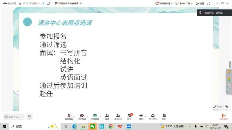 随后,武思璇详细介绍了语合中心选派志愿者的流程,涵盖报名、筛选、面试、培训、赴任等多个环节,为有志于从事海外中文教学工作的学生提供明确的方向指引。