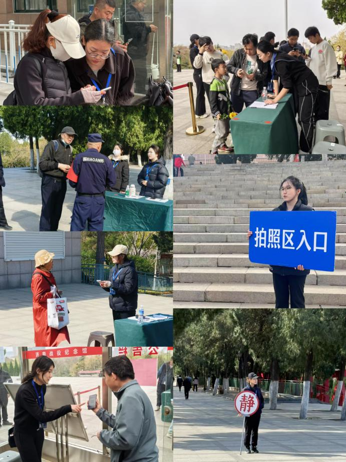 在活动现场,志愿者们分工清晰、职责明确。负责各门口秩序维护的小组,有条不紊地指挥着团队有序前行,有效避免了拥堵情况的发生,同时还积极协助整理宣誓队形,确保每一个环节都整齐规范。散客通道处的志愿者们,始终保持着亲切和蔼的态度,耐心细致地向散客告知身份证验证、微信预约以及登记等入场方式,全力保障每一位散客都能顺利进馆参观。在固定楼梯和等候区域,志愿者们时刻保持警觉,密切关注着现场的动态情况。他们以礼貌温和的语言引导大家有序拍照,精心维护着拍照秩序,让整个现场氛围既热烈又井然有序。而在大门口与楼梯处,志愿者们更是热情满满,耐心解答参观者关于场馆布局、参观流程等各类问题。他们主动提供详细周到的讲解服务,让参观者们能够更好地了解场馆信息,享受参观过程。