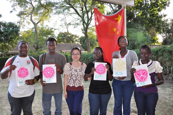 2012年,逄思佳在肯尼亚肯雅塔大学剪纸体验活动中与学员合影