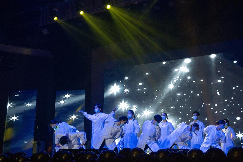 聚光灯下,鼓声乍起,开场歌舞《鼓舞盛世》以其律动的节奏、雄浑的鼓点,热烈的舞蹈,激发了青春的活力,点燃了在场师生的热情,正式拉开了晚会的序幕。晚会以“筑梦青春,共谱华章”为题,共分为三个篇章。