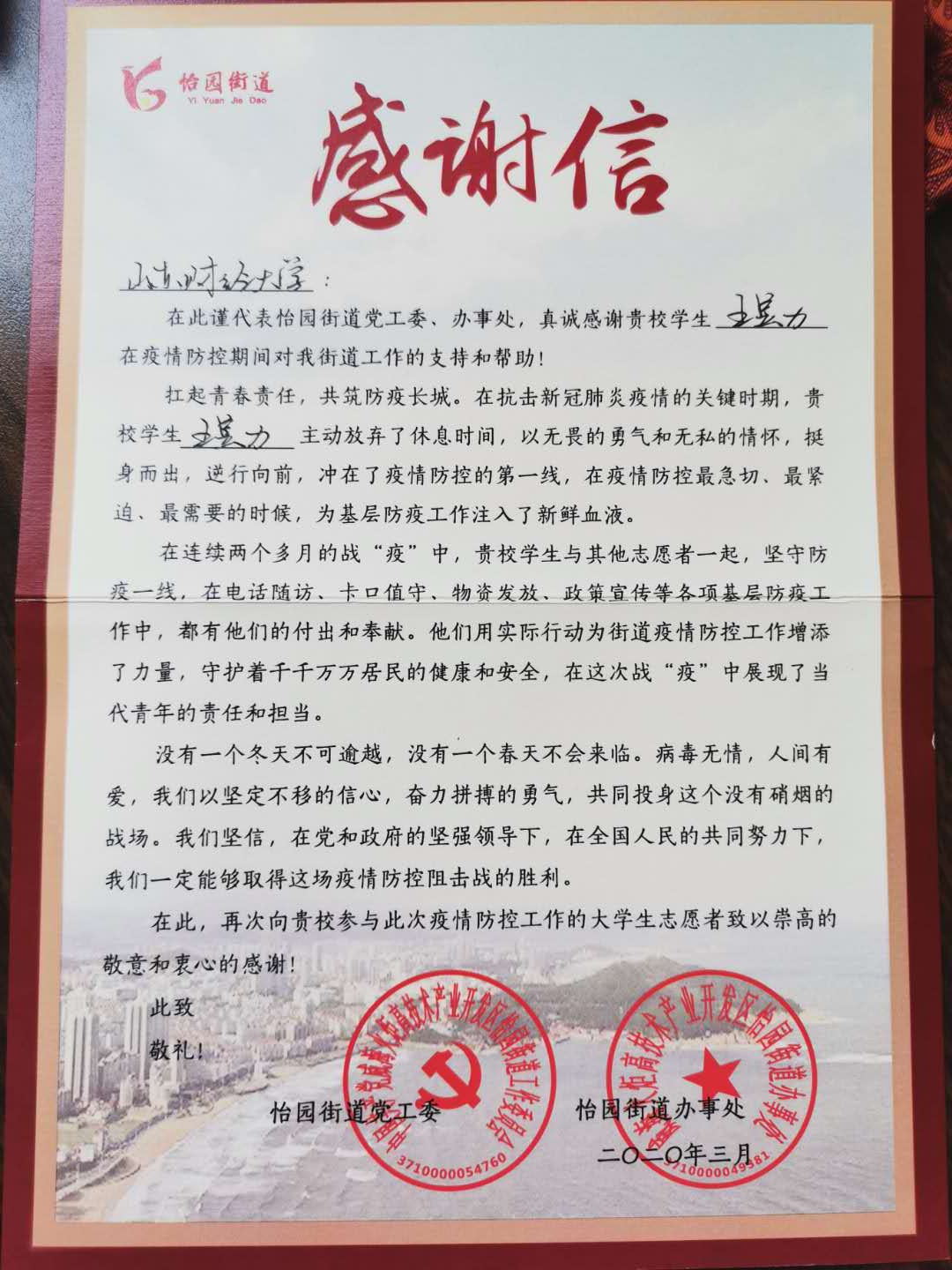 王昱力同学加入山东省威海市高区中盛园社区志愿服务队,在社区站岗,协助抗击肺炎。