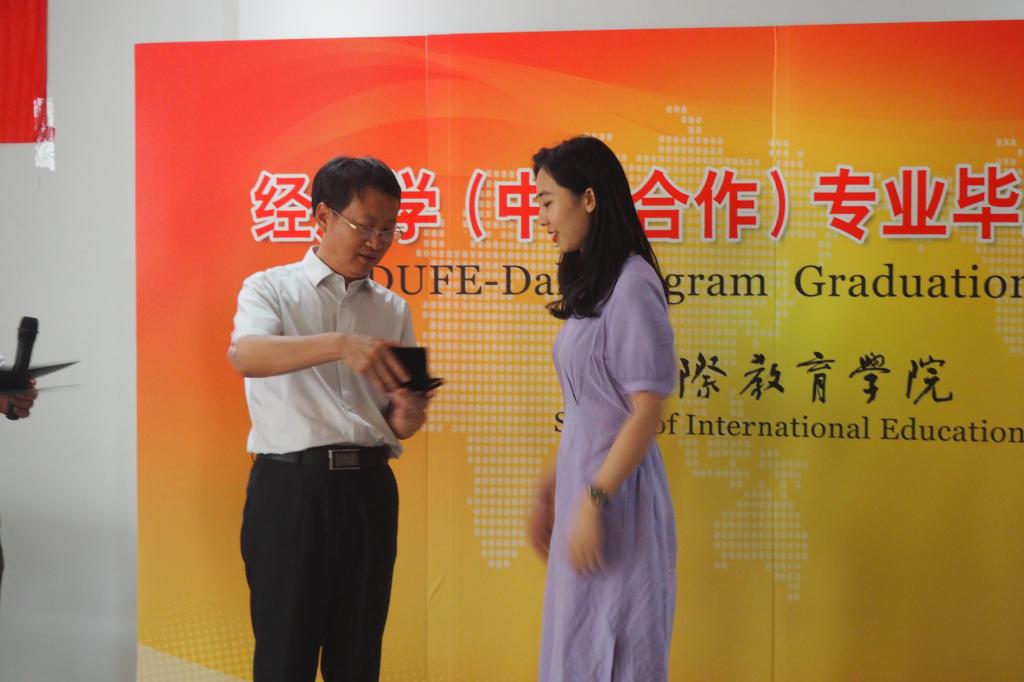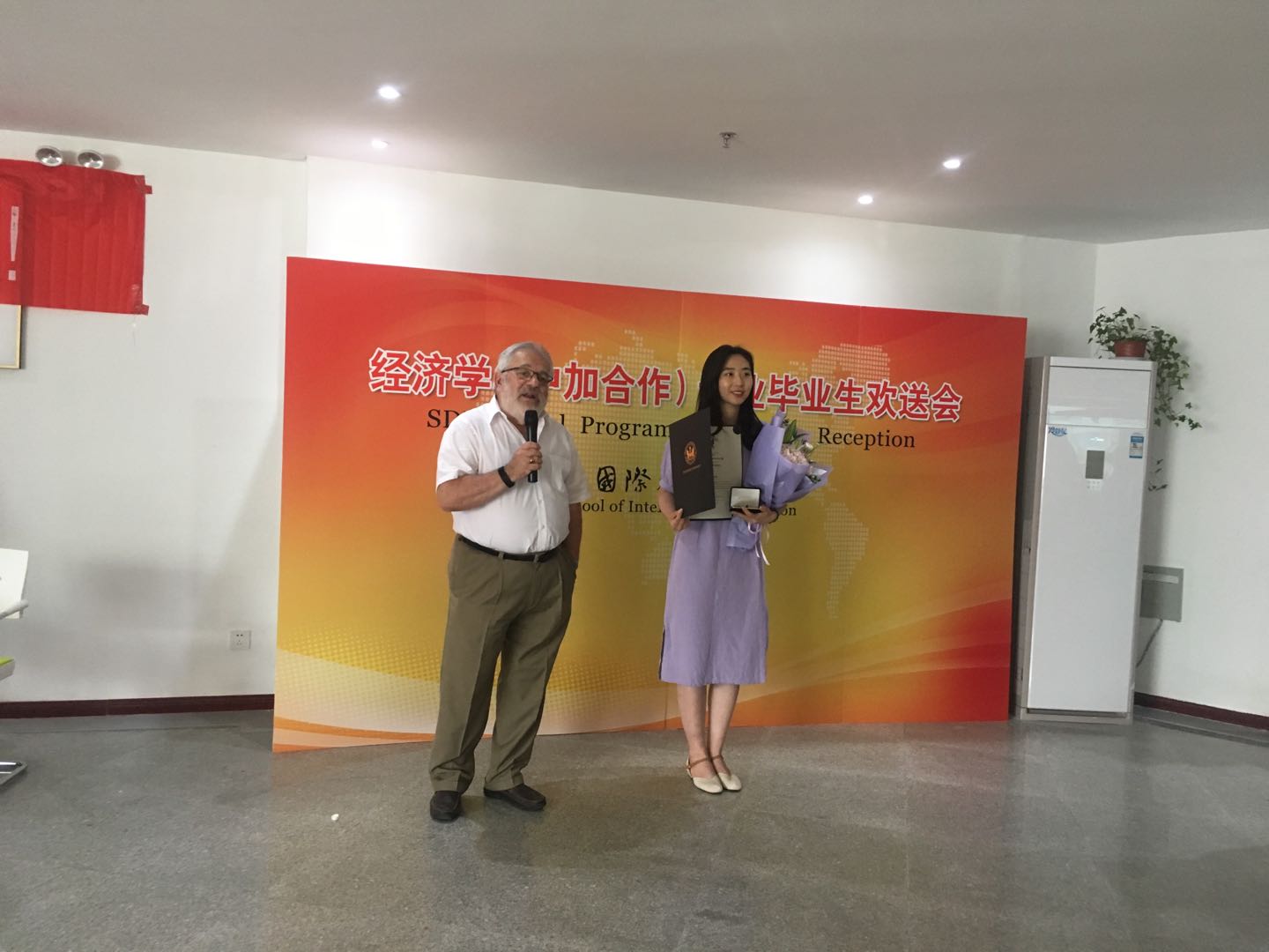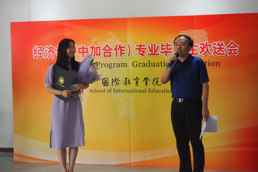 Barry教授作为中加项目加方负责人,专程从加拿大赶来参加我校毕业典礼和中加项目毕业生欢送会。他为2018届中加毕业生们送上真诚的祝福,并对获得达尔豪斯大学“大学奖章”的王佳文同学提出表扬。王佳文同学在达尔豪斯大学学习期间,认真刻苦,表现出色,取得了该学校经济学专业的最高分,成为我院中加经济学专业毕业生中第四个获此荣誉的学生。韩作生副校长和Barry教授为王佳文同学颁发了荣誉证书和奖章,祝福她在未来取得更好的发展,希望其他同学以王佳文同学为榜样,在今后的学习和工作岗位上取得优异成绩。