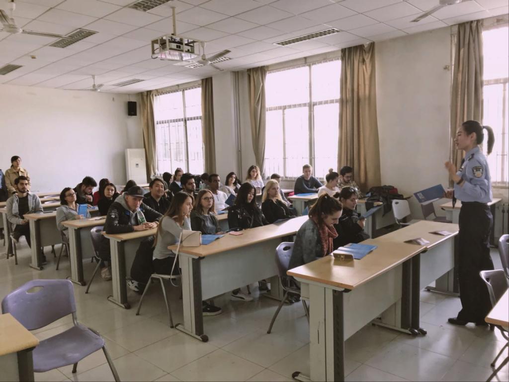 讲座在我校舜耕校区研究生楼101教室举行,首先市中分局出入境管理科副科长张慧带领留学生学习了《外国人在济南生活安全指南》;同时,根据当前形势,增加了反恐教育宣讲环节,让留学生们了解反恐工作的重要性。张慧列举了两起以往在济南留学生中间出现的人身安全的案例,帮助我校留学生更直观的了解可能面对的奉献以及相应的安全防范措施。舜玉路派出所副所长朱琳向留学生们发放了针对外国人群体专门设计的“警民联系卡。