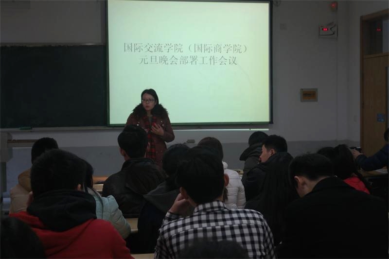 为了合理部署元旦晚会工作的具体事项,办一场有国际特色的文艺晚会,月日,院团委按照院党委领导的指示在舜耕校区顺利召开2016年元旦文艺晚会部署工作会议。学工办主任兼团委书记王坤老师、团总支朱维霞老师出席会议,学生会骨干成员及、级全体班长、团支书参加此次会议。会议由王坤老师主持。