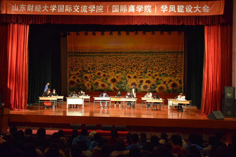 为了让2014级新生进一步学习学校有关的考试规章制度,从而严肃考纪,真正做到“诚信应考”。12月11日下午,国际交流学院(国际商学院)话剧社的同学们在舜耕校区礼堂,为领导、老师和同学演出了一场别开生面的话剧《考生众生相》。院党委书记孙玉杰教授、院党委副书记张红燕副教授、学工办全体老师和2014级全体新生观看演出。
