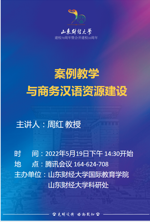 主讲人简介:周红,上海财经大学教授,硕士生导师。主要从事现代汉语语法、汉语国际教育、语言习得研究。主持完成国家社科基金项目2项,出版著作《现代汉语致使范畴研究》、《语篇知识建构与对外汉语写作教学研究》、《汉语动趋式的认知语义研究》,在国内外学术期刊发表学术论文70余篇,主编《卓越汉语·商务致胜(1-5册)》、《卓越汉语·商务写作(上/下册)》、《纵横商务汉语案例教程》等商务汉语教材12部,《汉语研究方法导引》研究生教材1部。现主持教育部项目1项,语合中心项目1项,校重点课程2项。