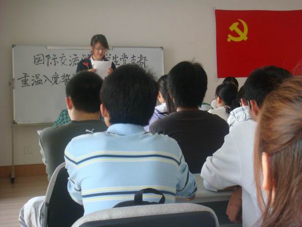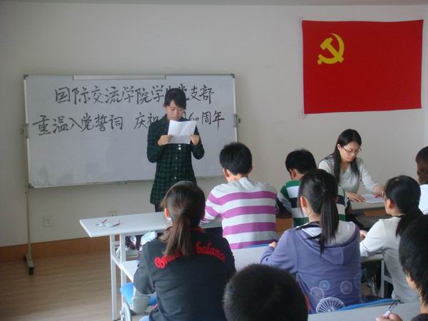 (通讯员 张红燕)为了进一步加强大学生党员尤其是新生党员的教育、管理和培养工作,以实际行动迎接建国六十周年,9月23日中午,国际交流学院党总支组织学生党支部的全体党员及部分入党积极分子代表举行了“迎接建国六十周年 重温入党誓词”宣誓仪式。全体与会党员怀着无比激动的心情,面对鲜红的党旗庄严宣誓,重温入党誓词。