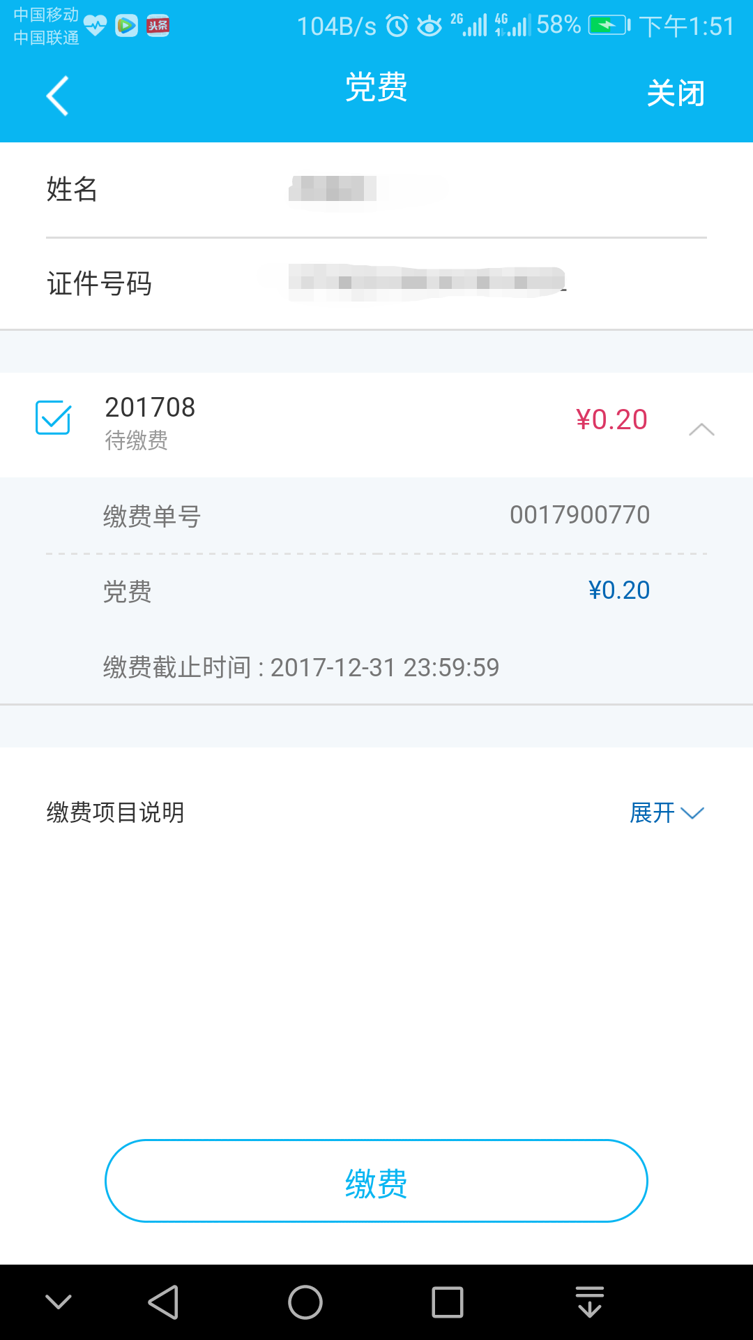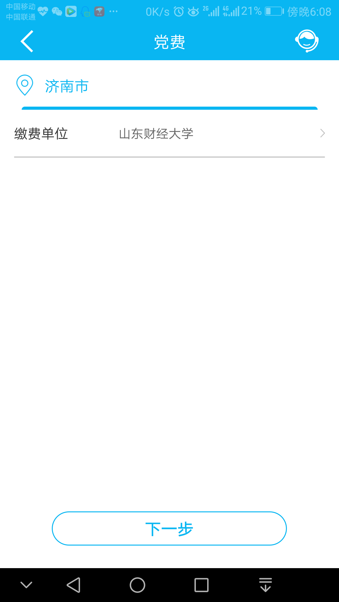 3、持有建设银行卡的党员,下拉直接选择党费,缴费地区“山东省济南市”,缴费单位找到“ok138cn太阳集团529”下一步输入姓名及身份证号查询即可(可以输入别人的信息帮忙代缴),如果页面跳转显示所需缴纳金额,在付款账号中输入银行卡号缴纳即可,如果显示您没有未交费订单,则说明本期党费缴纳未开始。
