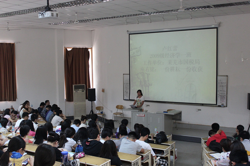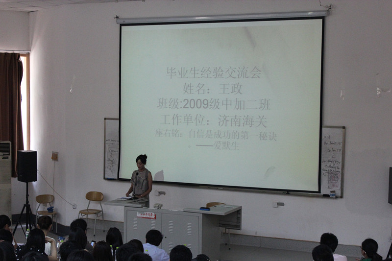 会上邀请了09级中加班11位优秀学生代表为10级中加全体同学和11级中加部分同学分享他们的学习和就业等方面的经验。09级经济学1班的卢红蕾和2班的王政同学针对公务员考试分别从笔试和面试两个方面分享了各自成功的经验。09级经济学1班张敏、2班的左思明和3班的王诗嫣针对国内考研分享了她们成功的考试经历和成功的心得。09级经济学1班的孟瑞、2班的解洋和3班的赵晢伊跟大家分享了就业方面的经验。09级经济学1班的高大海、赵亚宁和周禛就国外申研分别提出了自己的看法,分享了各自出国深造的心得和体会。