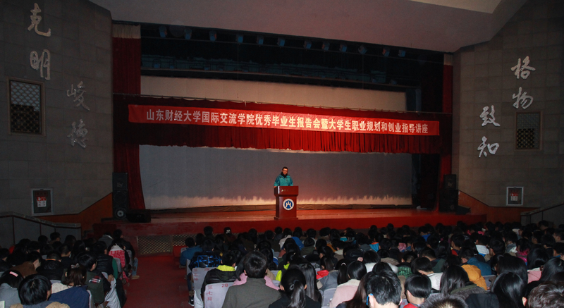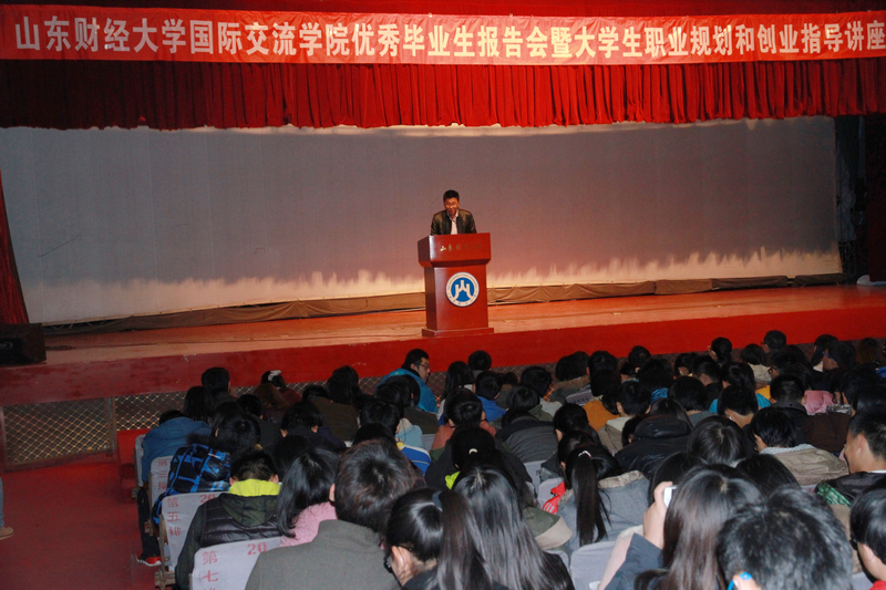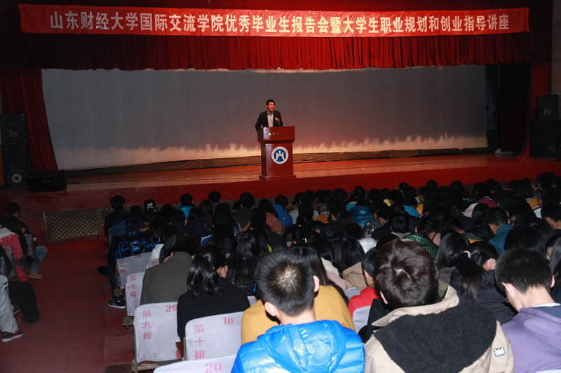 为了使同学们更好的汲取优秀学长们的经验,便于以后大学生活和学习规划,国际交流学院于11月22日晚19点在舜耕校区礼堂举办了优秀毕业生报告会暨大学生职业规划和创业指导讲座。出席本次会议的有学院党总支书记郑磊教授,学院党总支副书记张红燕副教授,以及学院学工办的各位老师。