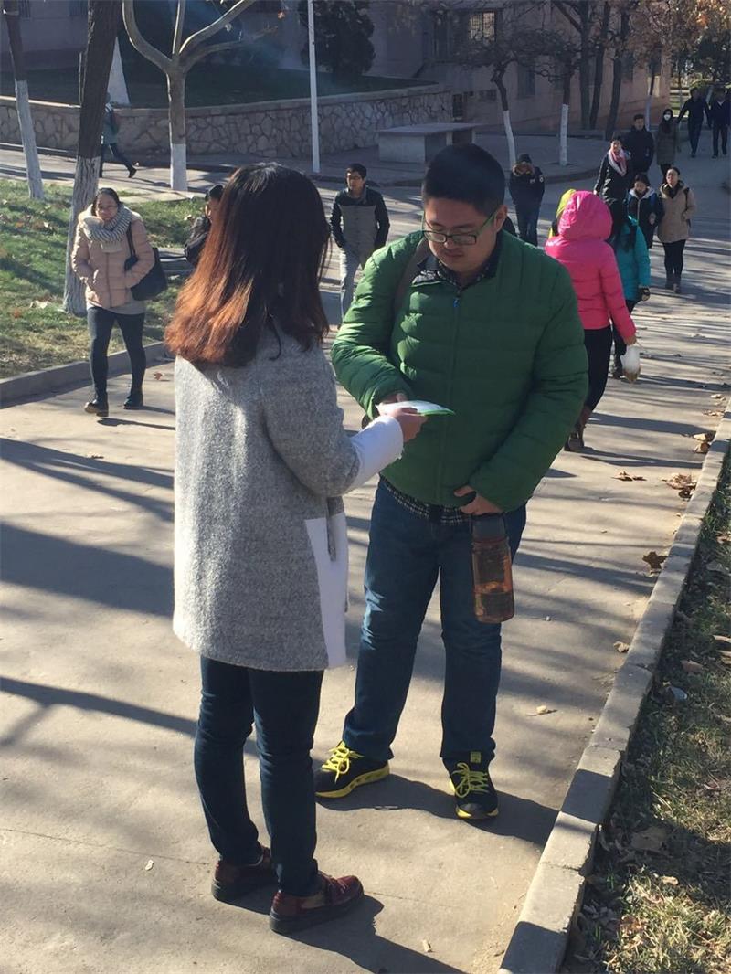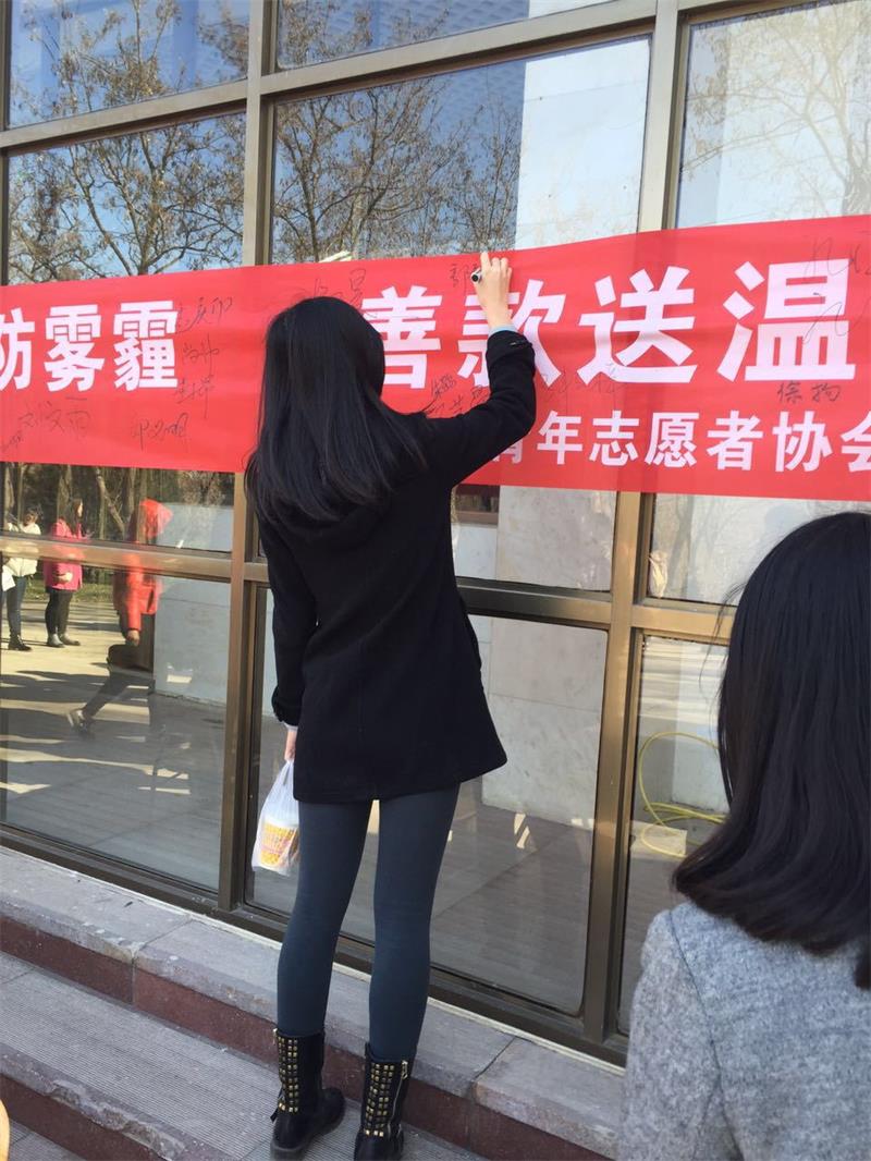 16日中午,青协同学开始义卖活动,义卖中成员们积极宣传,主动向大家介绍活动意义,我校学生也自发参与,积极购买防雾霾口罩。随后,所有活动参与人员都在活动横幅上签上了自己的名字,留下了一份珍贵的回忆。青协于预期时间之前完成所有口罩的义卖,并将义卖善款全部用于为老人们购买保暖衣物。