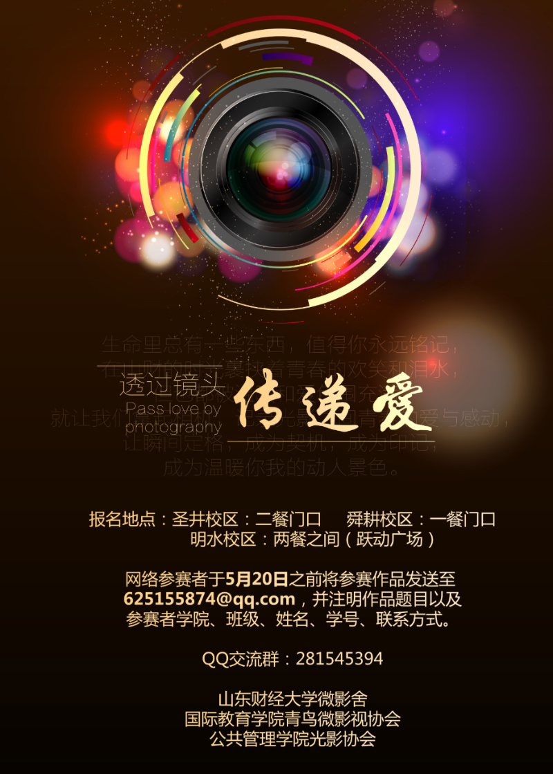 5月20日,在舜耕校区二食堂门口、明水校区餐厅门口,ok138cn太阳集团529摄影大赛正式拉开帷幕。此次摄影大赛是青鸟微影视协会与微影社、光影协会共同举办的校级活动,比赛以“透过镜头传递爱”为主题,邀请同学们一起纪录转瞬即逝的一抹温情。举办方同时进行了大赛的宣传工作,通过传单、扫码的方式,让更多人了解到本次比赛。比赛分为两个环节,第一轮把收到的优秀作品Po在山财大青鸟微影协的公众号上,进行为期一周的初赛投票,决出十幅优秀作品进入决赛。第二轮由闫实老师、黄中禹老师、李安民老师三位专业摄影师进行专业角度的评分评判,最终决出一等奖、二等奖、三等奖和优秀奖等多幅作品。