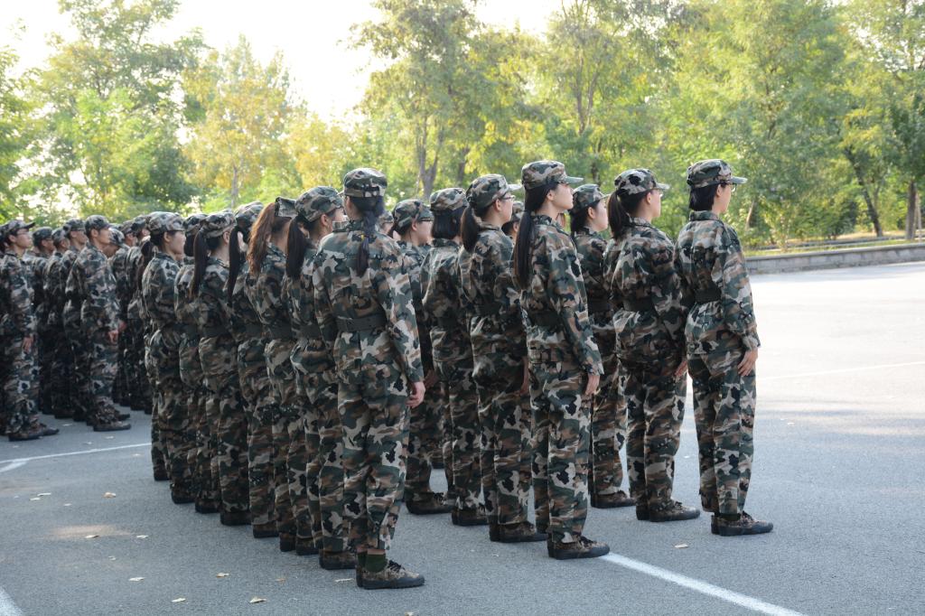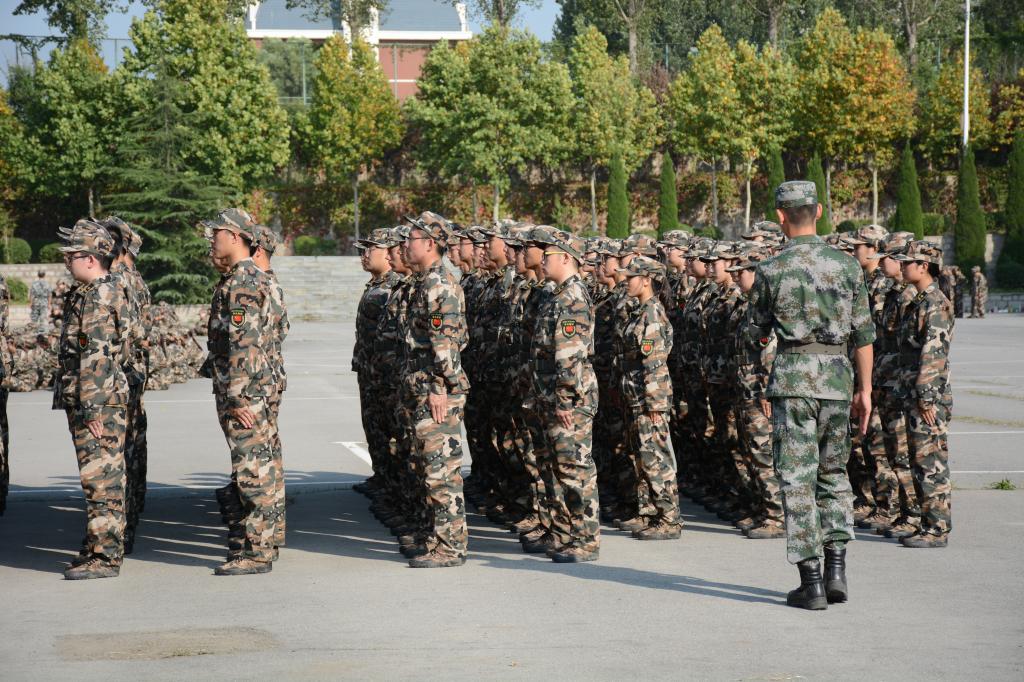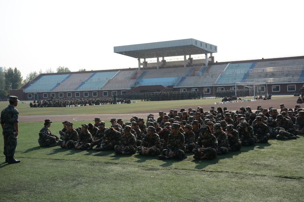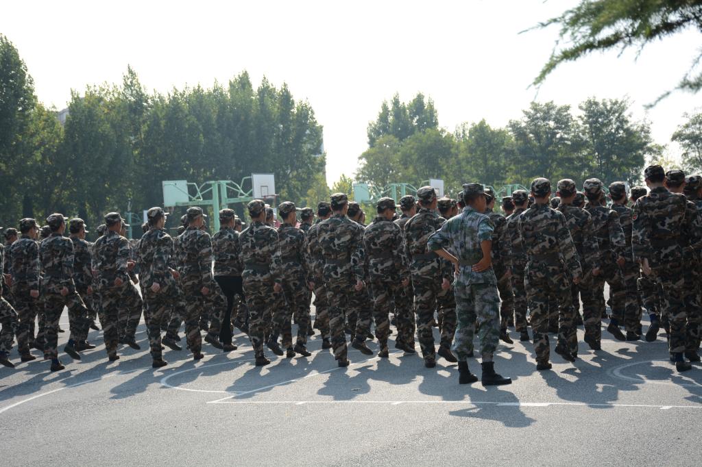 军训第一天,军官们严格要求新生整理军容和端正军姿,不时亲自示范,并手把手纠正基本的动作,同学们在英姿飒爽的军官的带领下认真训练,丝毫没有半点偷懒,喊着“一二一,一二三四”的口号踢着正步,远方的绿茵草地和他们绿色的迷彩服相互映照,显得活力十足。