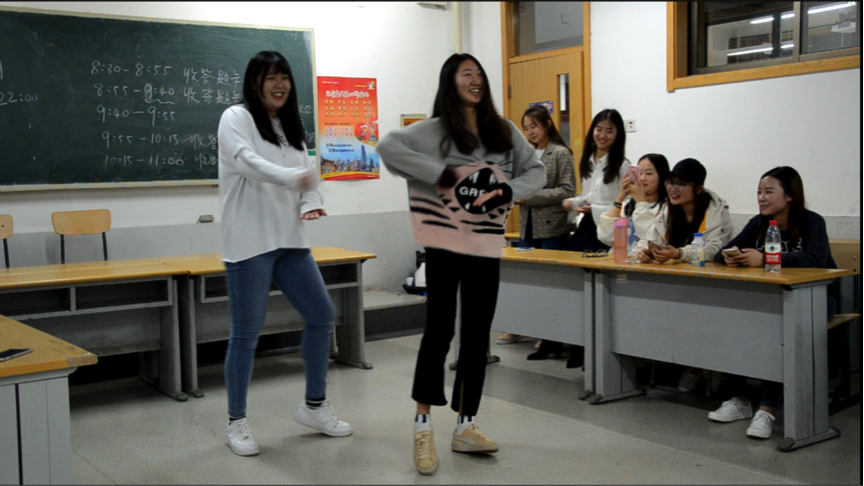 为了给大家最后评分的缓解压力,舞社副社长李奕童和友情赞助的青年志愿者协会副社长刘晓溪为舞社成员带来了诙谐幽默的网络舞蹈——海草舞和捣蒜舞,最近一段时间我们无论是在微信、微博还是各种网络互动平台上总是能够轻易的听到或者看到《海草舞》的相关的视频,虽然动作难度不高,但这无疑为斗舞紧张的气氛带来了欢声笑语。