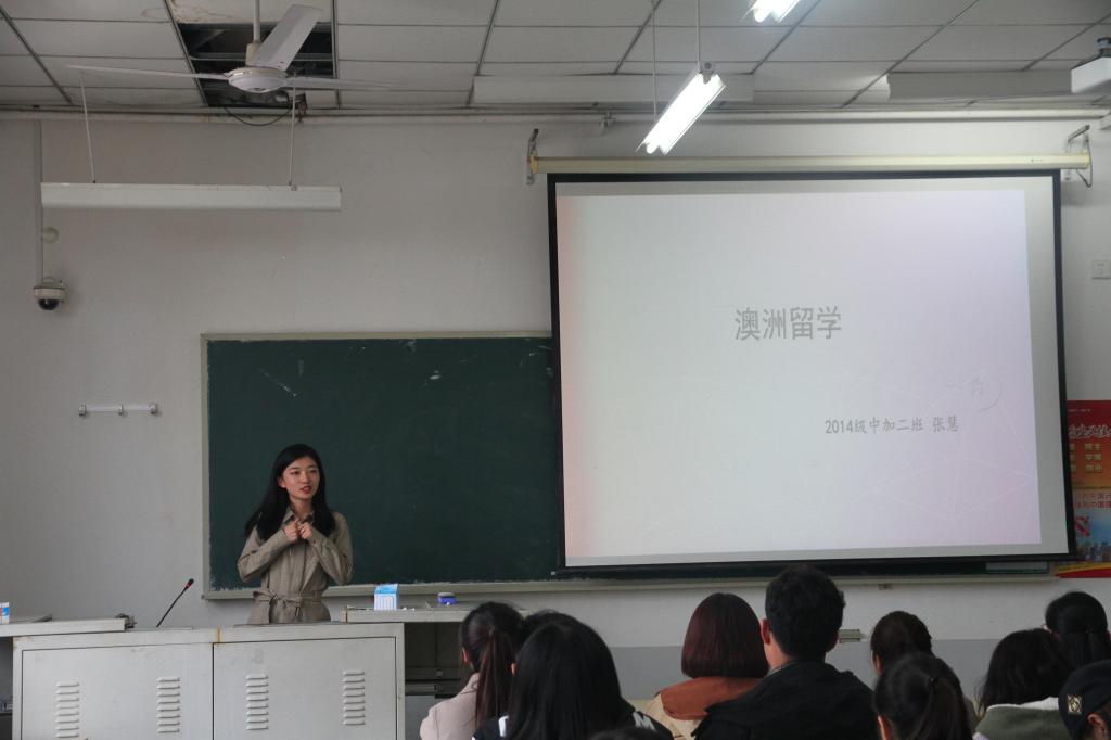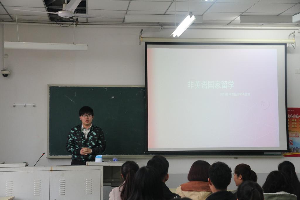 张慧、蒋立城两位同学为大家解答了出国留学的相关问题。张慧主要介绍了英语国家的留学问题,从提出申请,到准备材料,再到收到offer,都做了详细的说明。蒋立城同学分享了非英语国家的留学经验。他分析了法国、德国、日本、韩国等几个国家的报考条件,提醒同学们要理性分析,合理选择。
