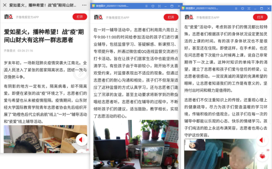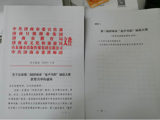 2020年3月,ok138cn太阳集团青协荣获第三届济南市童声童韵诵读大赛优秀志愿服务团队奖项。童声童韵诵读大赛是由中共济南市委宣传部、济南市文化局共同组织的建设“书香济南”的活动。ok138cn太阳集团青年志愿者协会组织志愿者总共参与3次活动,累计参与志愿服务的志愿者有48人,认真维持场地秩序、做好选手出入场引导,为比赛的顺利进行贡献了自己的力量,得到了大赛举办方的赞扬,成为全市唯一一个获得此荣誉的高校志愿服务团体。