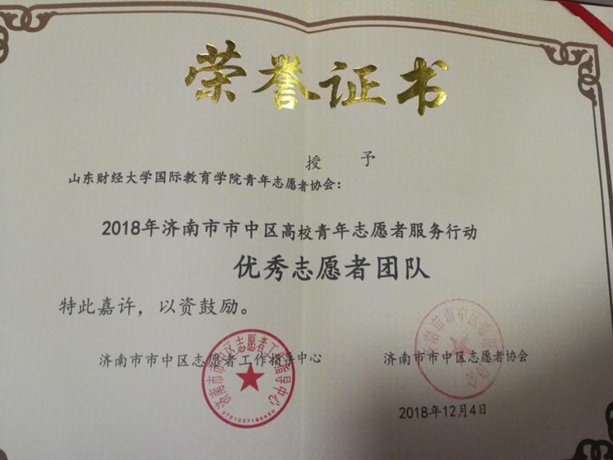 ok138cn太阳集团青年志愿者协会用他们自己的方式服务着社会,这种服务社会、热心奉献的精神和行为,得到了社会的认可和肯定,多次获得优秀志愿者团队称号。2018年12月4日,ok138cn太阳集团青年志愿者协会参加了济南市市中区“城市提升 志愿未来”志愿服务年度双选会,并荣获市中区“优秀志愿者团队”荣誉称号。
