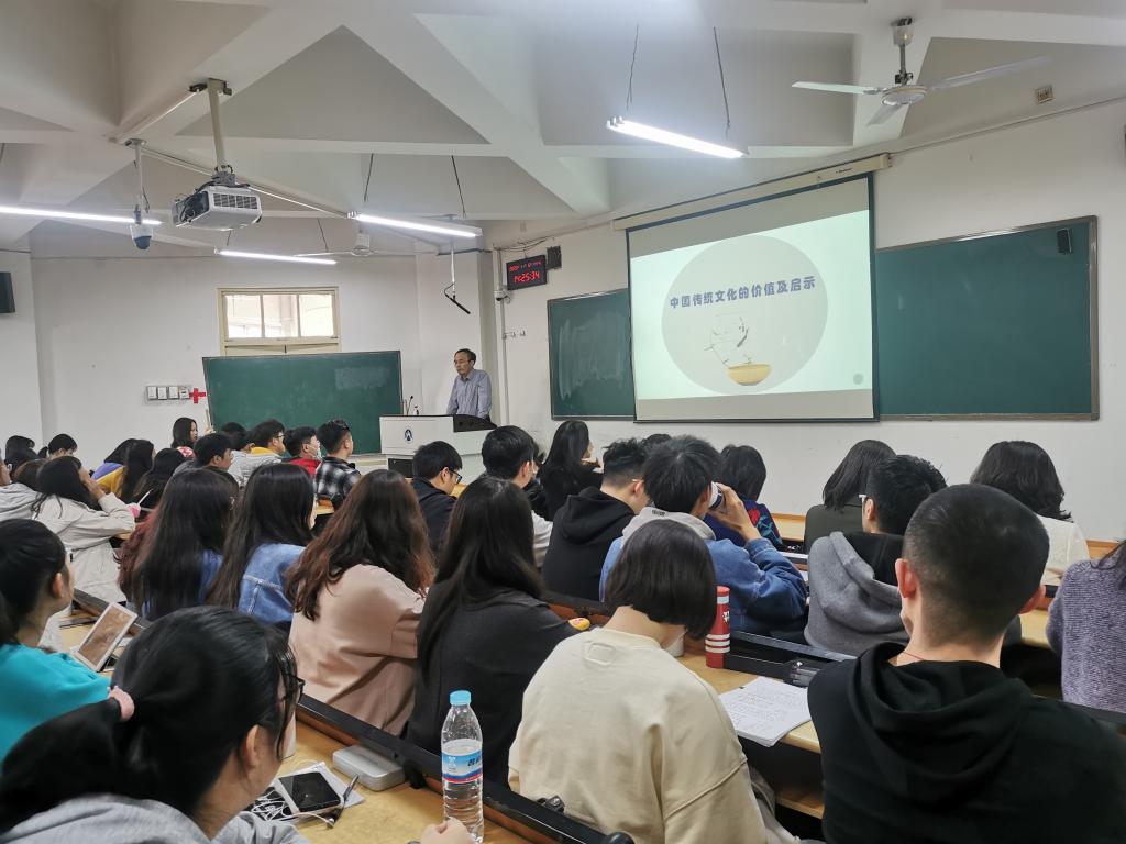 张建指出,学习传统文化的主要作用就是用以指导生活,补强我们的价值观,他从八个方面概括了传统文化的价值与启示:刚健有为的进取精神、为仁由己的价值追求、勇于自省的人格修养、天下为公的淑世情怀、淡然物外的超越态度、权变通达的处事方式、不流世俗的审美情趣、虚静恬然的立身之道。讲解中,联系同学身边事例,深入浅出进行了讲解,教导同学们要做到不断自省,加强自身磨炼,妥善的处理好人际关系,在得与失面前不要过于计较,要心胸开阔,做人坦荡,脚踏实地,真正将传统文化的精髓深入到本心。