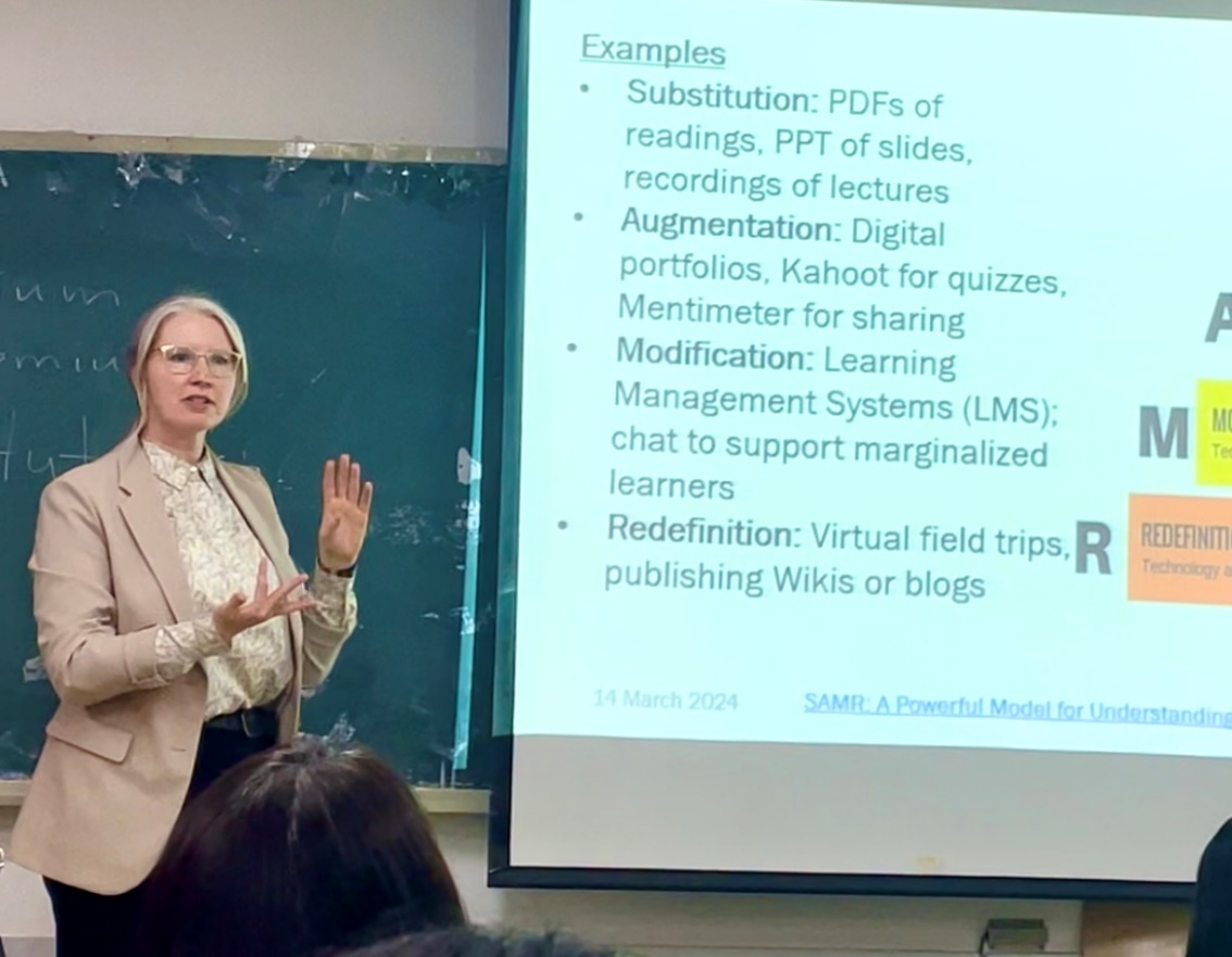 3月14日、21日下午,ok138cn太阳集团邀请Jennifer J. MacDonald博士在舜耕校区1106、2501教室举办系列讲座。Jennifer为学院师生分别作了题为“Technology in language education”“Ten ways international study can advance your learning and future career”的报告。讲座围绕技术赋能教学及学生留学与发展两大主题,引导教师和学生思考如何将智慧技术与语言教学进行结合,为学生专业学习及个人发展提供系列建议,报告现场气氛热烈。