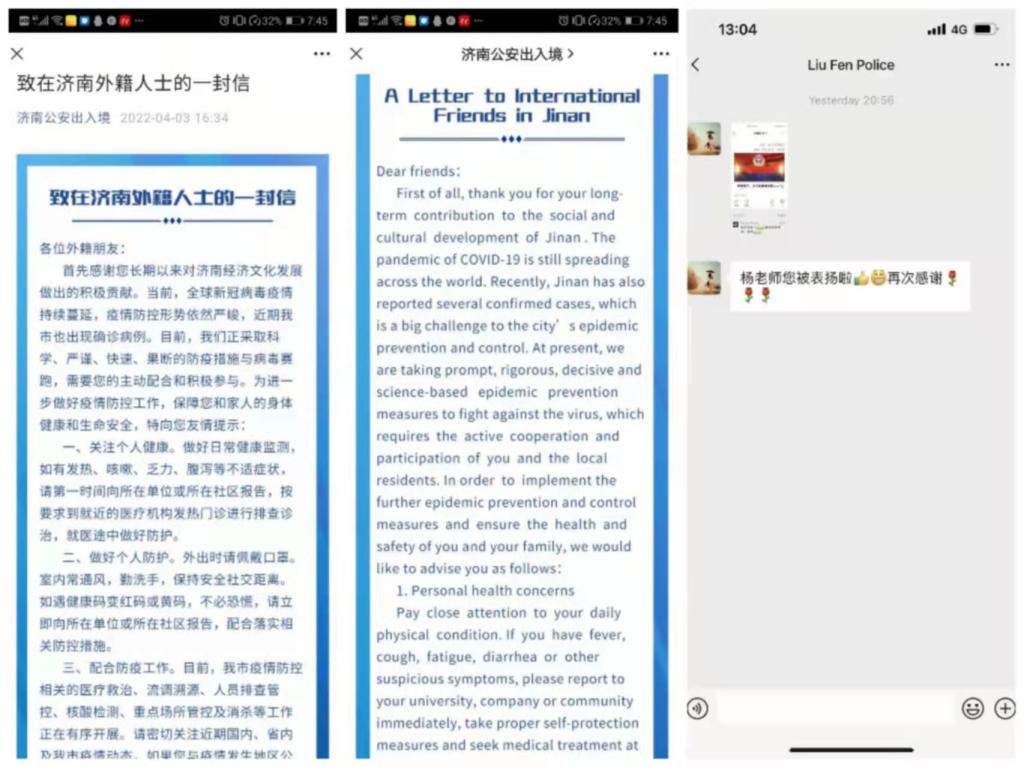 4月3日,济南市公安局出入境管理局发布了《致在济南外籍人士的一封信》,在得知此信后,留学生工作办公室杨鹰老师立即提笔翻译,旨在为留学生及时传达我市防疫工作指示,传递一份关怀和祝福。