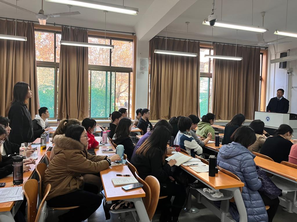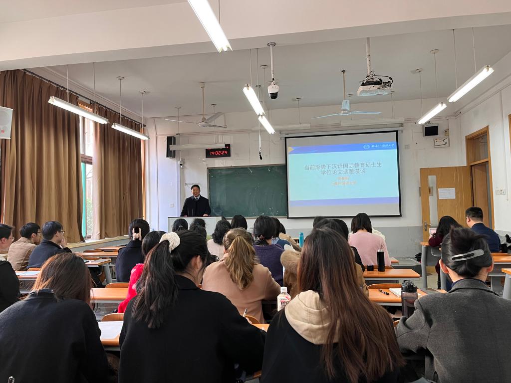 讲座结束后,吴教授与在场师生进行了亲切交流,并耐心回答了师生关心的学位论文写作问题。此次讲座为硕士生未来的论文选题提供了切实指导,更新了师生对新形势下汉语国际教育发展前沿的认知,促进了师生对学位论文选题与撰写的进一步思考。