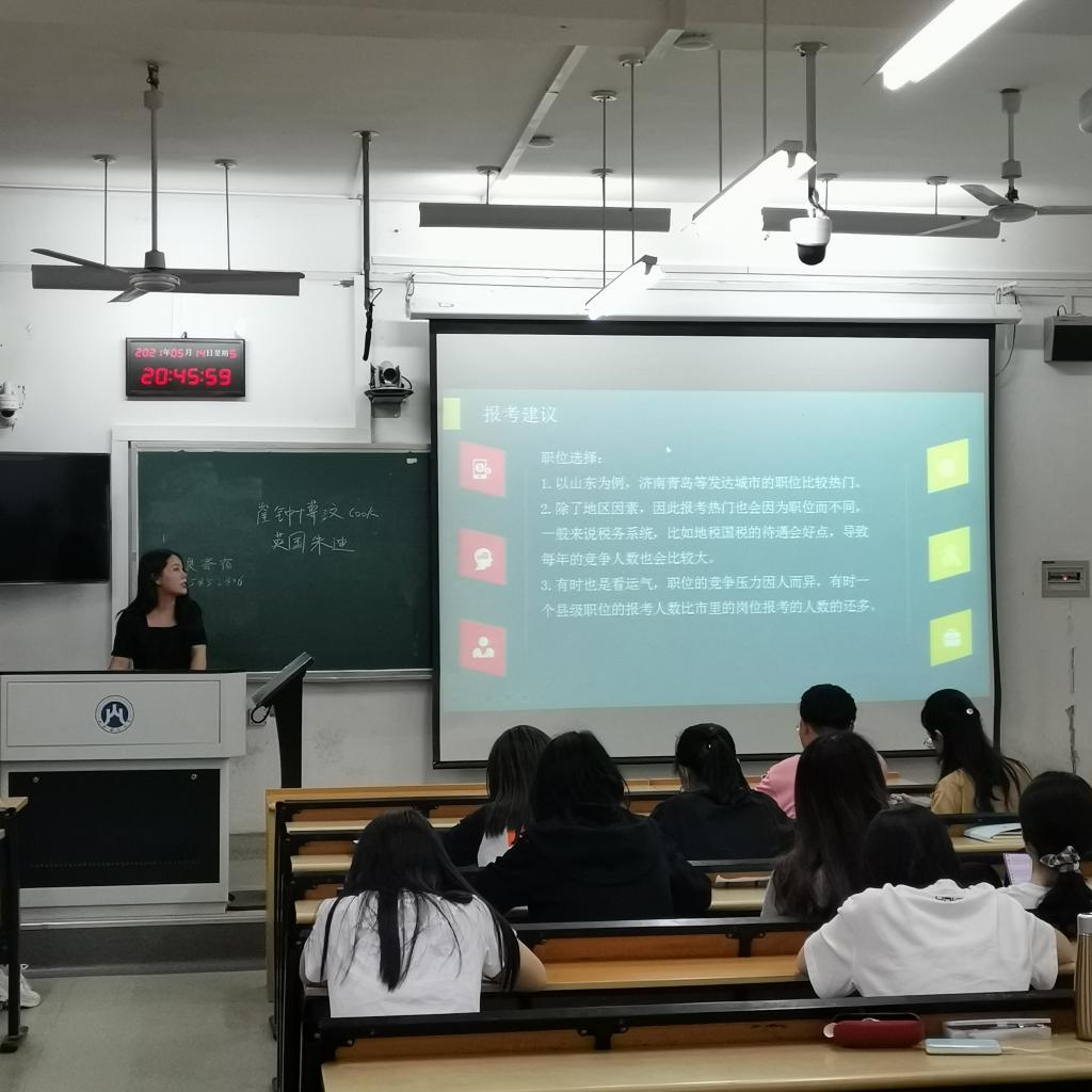 首先,毕业生们对自己进行了简单的介绍,赢得了同学们的热烈掌声,随后他们分别就申请出国、保研考研、科研竞赛、工作实习、选岗考公等方面分享了自己的经验,语言亲切幽默,现场气氛一片轻松活跃。成功考取山东大学的陈鹤文在讲述自己考研历程的同时,鼓励同学们积极争取实习机会,并提醒同学们“考研是途径,工作是目的”;成功考取中国社会科学院大学的司敏、考取对外经济贸易大学的陈璐向同学们分享了自己考研复习的经验,她们提出时间规划很重要,并给出了数学、英语、政治等科目的备考策略;成功申请香港中文大学的于康宁就如何申请实习和留学两方面进行了经验分享,他希望同学们抓住时机,努力提升自己;考取临沂市国税局的李晓分享了自己公务员上岸的经验,就考公流程、职位选择、笔试面试准备等方面进行了详细的介绍。最后,学长学姐们提出多交流,提高眼界交际能力;多读书,多锻炼,保持身体健康等建议。会上,同学们纷纷提出自己遇到的困难和疑惑,得到了学长学姐的悉心指导,大家积极交流,气氛热烈,交流会最终在一片其乐融融的气氛中圆满结束。