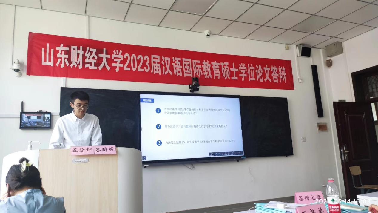 5月14日,2023届汉语国际教育硕士学位论文答辩会在舜耕校区3405智慧教室顺利举行。此次答辩共有16位硕士学位申请人,分上半场和下半场进行,答辩委员会主席分别由山东师范大学王其和教授与山东大学王尧美教授担任,答辩委员由学院汉语国际教育硕士生导师组成。学校研究生院副院长王丽萍亲临答辩现场进行指导。