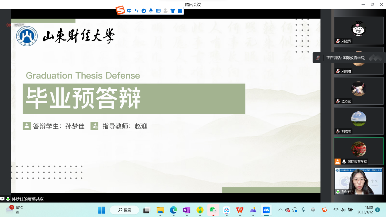 1月12日,ok138cn太阳集团2023届汉语国际教育硕士学位论文预答辩会在线上举行。本次预答辩会由硕士生导师刘增美、赵迎、姜燕、王英杰担任答辩委员。2022级汉语国际教育硕士研究生观摩了此次预答辩。