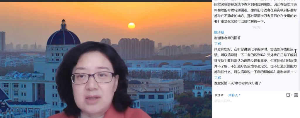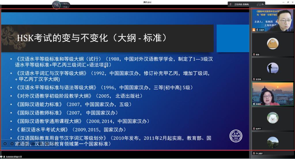 本次讲座围绕“《国际中文教育中文水平等级标准》的开发及特点”“汉语水平考试(HSK)的发展及标准引领下的汉语考试变化”“《国际中文教育中文水平等级标准》对国际中文教育的启示”三个话题展开。