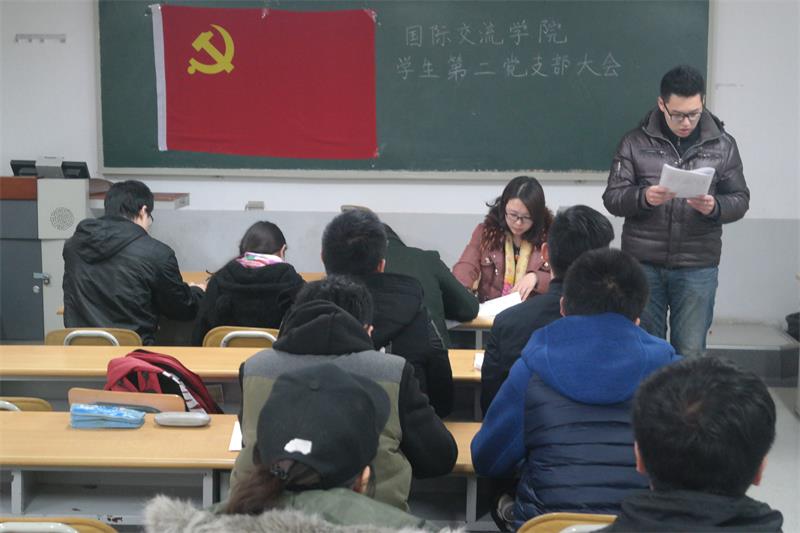 2015年12月24日中午,国际交流学院(国际商学院)学生第二党支部在舜耕校区1106教室召开了支部大会,会议主题是吸收预备党员及预备党员转正,支部全体学生党员和本期发展对象参加。大会严格按照接受预备党员和预备党员转正的支部大会程序进行,最后经全体正式党员无记名投票表决,一致同意接收本期9名发展对象成为中共预备党员,同意1名预备党员按期转为中共正式党员。